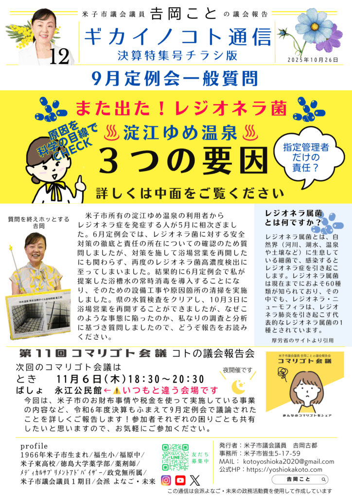 ギカイノコト通信No.12 9月定例会決算特集号 2025年10月27日 最終更新日時 : 2025年10月30日 yoshiokakoto 令和7年度9月定例会の議会報告となるギカイノコト通信No.12を作成しました。 主な内容 一般質問より また出た!レジオネラ菌 淀江ゆめ温泉3つの要因 不登校に関する情報提供について 決算審議より 腎臓病を悪化させないために 米子水鳥公園の活用を! 決算総括質問 主な採択の結果 会派よなご・未来で視察 画像をクリックするとPDFでご覧いただけます。 FacebookXBluesky